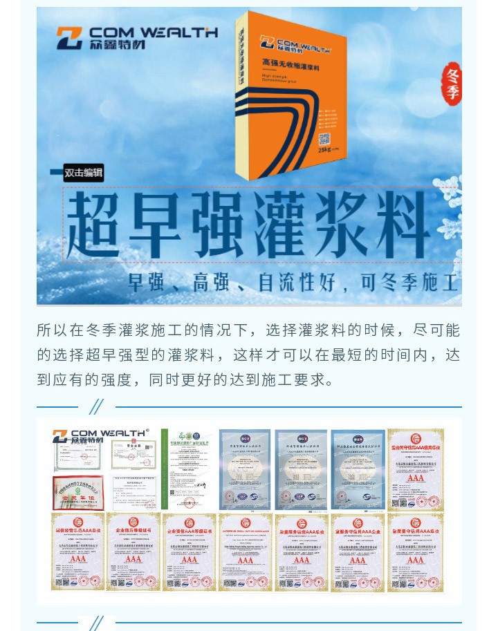大連志恒眾鑫專(zhuān)業(yè)生產(chǎn)銷(xiāo)售風(fēng)電灌漿料,強(qiáng)度80Mpa,100Mpa,110Mpa, 120Mpa適用二次灌漿,設(shè)備基礎(chǔ)灌漿,我們是大連灌漿料廠家,長(zhǎng)春灌漿料廠家,有環(huán)氧砂漿,套筒灌漿料,PC座漿料、自流平砂漿等50多種產(chǎn)品,可滿(mǎn)足您不同需求,有任何技術(shù)難題歡迎來(lái)電咨詢(xún):400-0411-552 眾鑫特材期待您的光臨!
